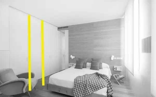 为什么定制的到屋顶的衣柜相比较买回来的成品衣柜,看上去没那么拥挤?我们来看一下这两种类型衣柜的视觉线条走向。