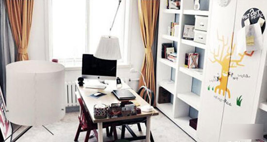 装饰提示:书房白色的大型书架,集中安排在靠墙的位置,使整个空间看见看起来十分整齐舒适,而书架中间的图画趣味十足,为书房增添不少生气。