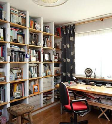 装饰提示:房间的主人非常巧妙的利用了墙的空间进行收纳。造型独特的书墙,既能收纳书籍,又起到隔断空间的作用,为房主营造出一个安静的读书空间。
