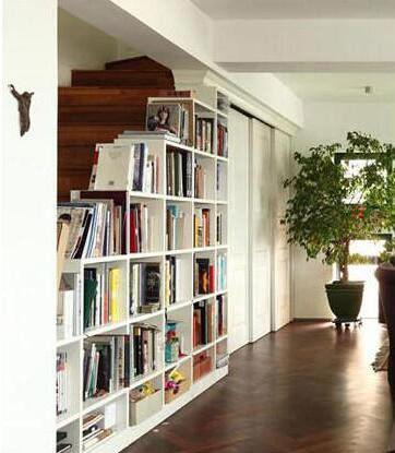 装饰提示:利用楼梯的坡度,在复式公寓的楼梯墙面用作书柜,实在是太聪明了。这样的储物量极大,可以解决大面积的收纳问题,但是,小编还是要提醒大家,为了安全,安装这样的书柜,还是要对楼梯底部加固处理噢!