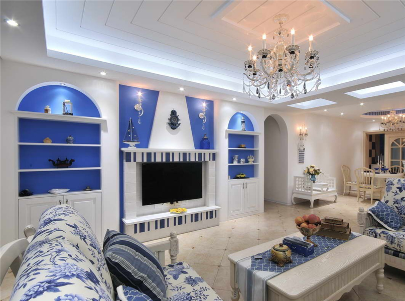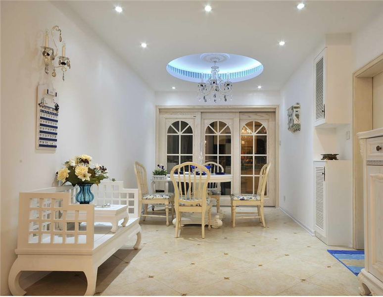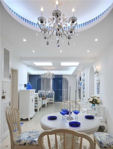 设计师在此次地中海风格的设计中,运用了比较典型的地中海的蓝与白的搭配特征,来诠释整个空间。让人联想到白色的村庄与沙滩、碧海蓝天连成一片,甚至门套、沙发、椅